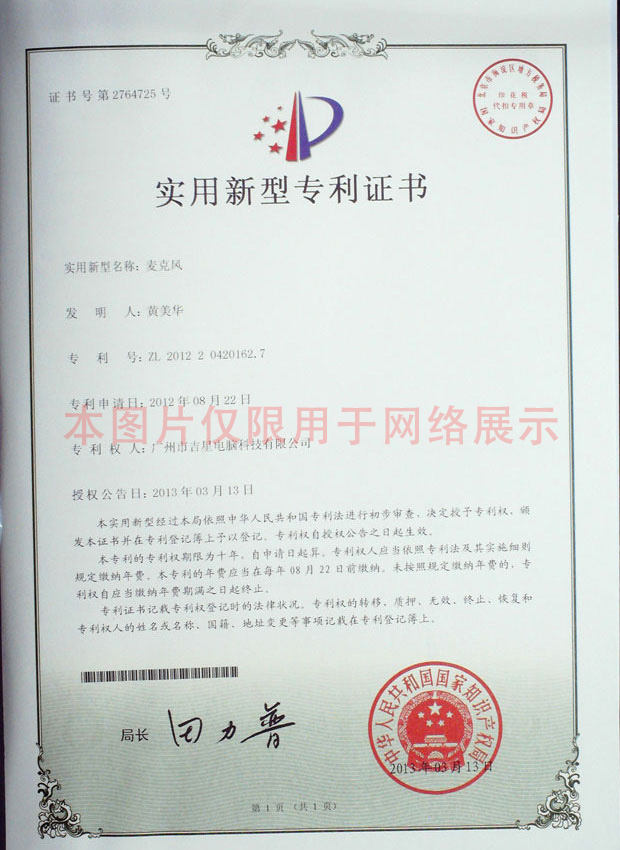 實(shí)用新型證書(shū)--麥克風(fēng)