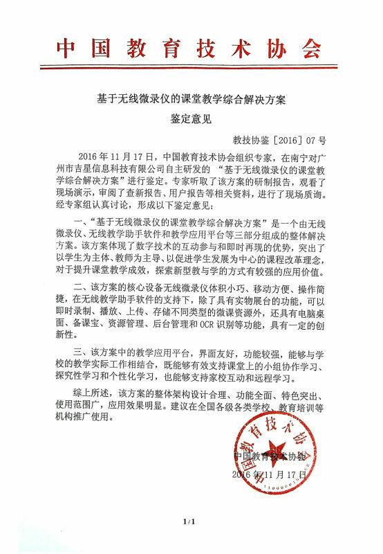 2016年11月17日下午,中國(guó)教育技術(shù)協(xié)會(huì)組織業(yè)內(nèi)頂級(jí)專(zhuān)家在南寧對(duì)吉星公司自主研發(fā)的“基于吉星無(wú)線微錄儀的課堂教學(xué)綜合解決方案”進(jìn)行了認(rèn)真的鑒定與研究,并形成鑒定意見(jiàn)如下: