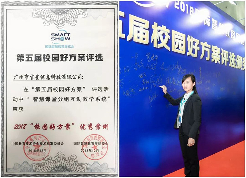 在2018國際智慧教育展上,吉星展示了基于數字化校園以學生為中心的智慧課堂分組互動教學系統方案收獲了客戶的一致好評,并榮獲 2018“校園好方案”優秀案例,吉星信息科技被評為2018智慧教育十大創新應用品牌!