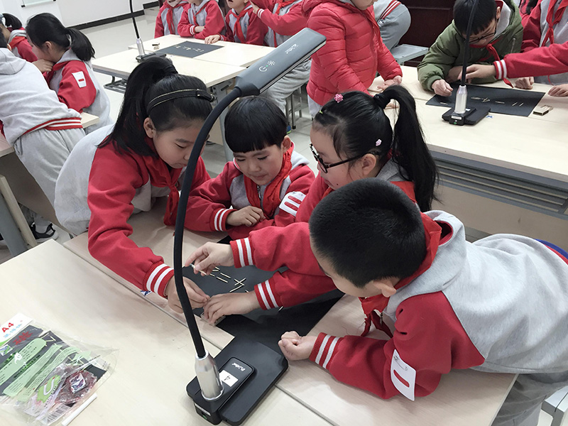 課堂上,解老師和楊老師結合無線微錄儀的互動特點,小組討論的同時利用微錄儀將小組的討論過程即時錄制讓同學們參與討論交流;老師啟發(fā)性提問,任意調用小組即時畫面,同學們積極的回答問題,分享自己的解題思路并在微錄儀下進行操作演示;應用分屏對比教學,對不同小組的作品生生互評,老師對重難點進行標注和講解。