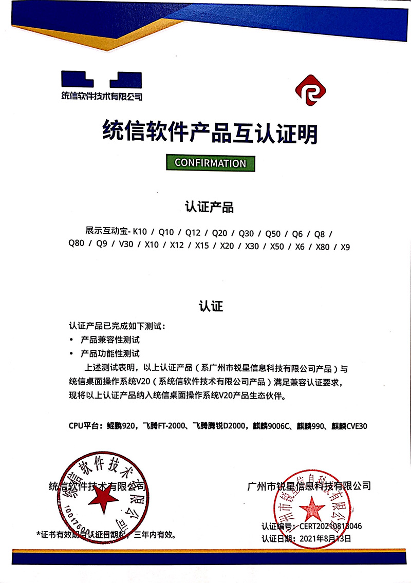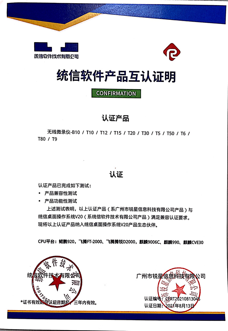 統信認證證書(展示互動寶、無線微錄儀)