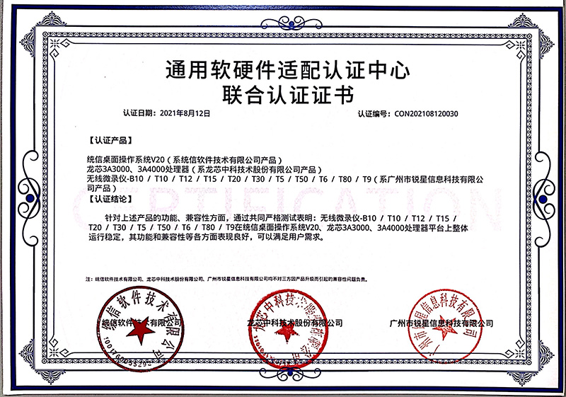 龍芯認證證書(展示互動寶、無線微錄儀)