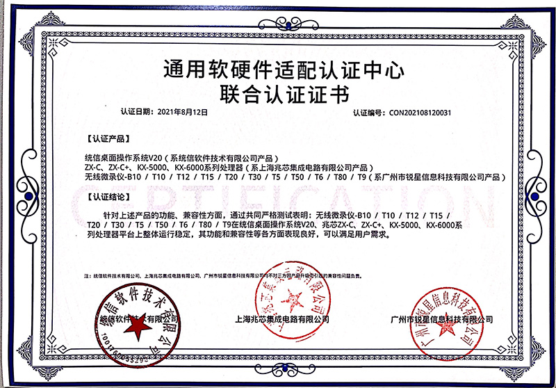 兆芯認證證書(無線視頻展臺、視頻采集互動終端)