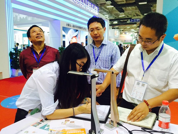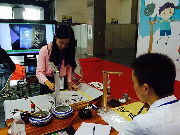 我們模擬搭建的“展示互動(dòng)書法課堂”是吉星展臺(tái)的一大亮點(diǎn),課堂上老師在無線展臺(tái)下進(jìn)行書法過程展示,畫面通過無線WiFi傳輸?shù)酱笃聊唬蠹铱梢酝ㄟ^清晰地觀察老師的執(zhí)筆方式、筆鋒走向和字體結(jié)構(gòu),進(jìn)行同步臨摹學(xué)習(xí)。經(jīng)過的大朋友、小朋友無不駐足圍觀,躍躍欲試,這么生動(dòng)活躍的課堂,通過吉星無線視頻展臺(tái)這一媒介,將來一定會(huì)復(fù)制到全國千萬學(xué)校課堂去,讓更多的師生從中受益!