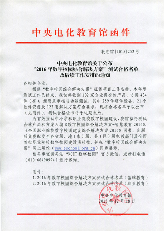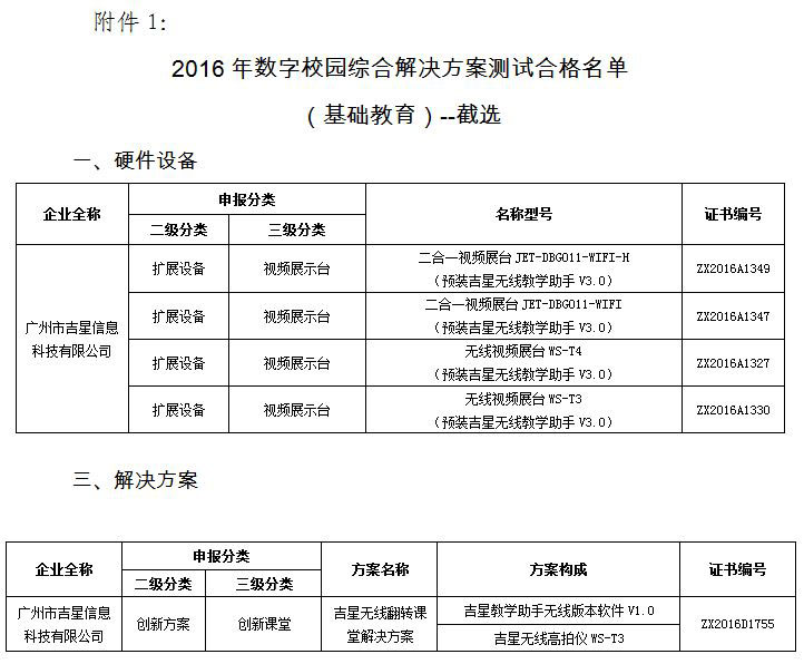 2015年12月24日,吉星無(wú)線視頻展和二合一視頻展臺(tái)等多款硬件設(shè)備和一個(gè)教學(xué)創(chuàng)新方案“吉星無(wú)線翻轉(zhuǎn)課堂解決方案”在眾多送測(cè)產(chǎn)品和方案中脫穎而出,成功通過(guò)了中央電教館2016年“數(shù)字校園綜合解決方案”檢測(cè)并將獲得證書,可參加各地區(qū)相關(guān)“數(shù)字校園解決方案”招標(biāo)項(xiàng)目。