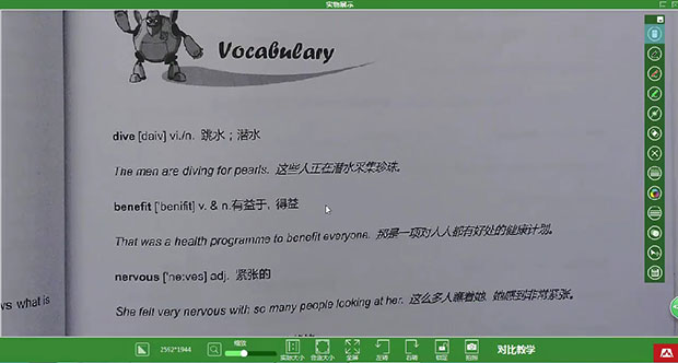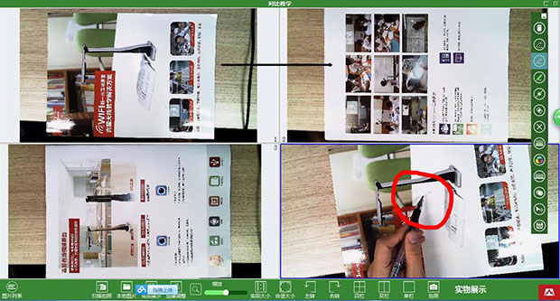實物展臺功能是老師們在課堂上用得最多的功能了。像素30萬到500萬的分辨率可自由調節,展示的圖片大小可進行縮放調節,圖片可左轉、右轉。老師還可隨時拍攝、采集圖片。將教材放置在展臺底下進行展示,500萬高清鏡頭可清晰展示小五號的字體,并且沒有任何噪點和閃動!