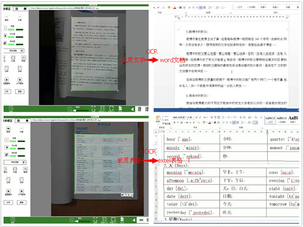 先把資料拍攝,截取想要識別的部分文件,選擇輸出格式,點擊識別,便可將圖片生成word或者excel等可編輯的文檔,大大提高備課、辦公效率。據我所知現在不少廠家的展臺都帶有OCR功能了,但是識別錯漏百出,效果不盡人意。所以本來我對這個功能并不抱太大希望,測試結果卻有驚喜。純文字識別率非常高,幾乎找不出錯誤;又嘗試了表格識別,表格中的中英文居然同時識別出來了,實在太強大了!