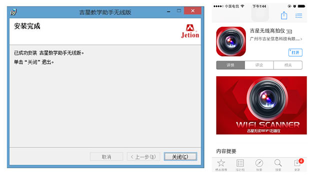 插入隨機附帶的光盤,里面有吉星無線教學助手軟件安裝包(setup.exe)、PDF格式的吉星無線教學助手使用說明及安裝說明。安裝非常簡單,根據提示一步步進行安裝,整個操作過程在1分鐘之內完成。安裝完PC端程序后,我又忍不住給我的手機也進行了移動端的安裝,想兩者同步進行測試,體驗一下廠家宣傳的多平臺無縫對接。
