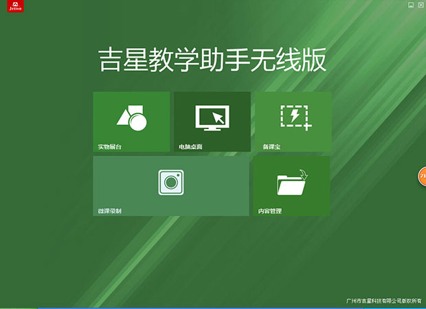 打開無線視頻展臺開關,在手機和電腦的搜索吉星展臺的WiFi信號(Jetion_后綴),輸入原始密碼12345678,即可連接上設備。沒拿到展臺之前我還在疑慮:無線展臺雖說可以脫線使用,但如果學校沒有無線網絡,那無線功能再方便也不實用啊!用了才知道,無線展臺內置WiFi模塊,自身會發射出WiFi熱點讓其它設備進行連接,實在太方便了!但操作進行到這里我又突然想到:像臺式機,沒有WiFi功能那怎么進行連接?帶著疑問又翻翻說明書,果然廠家早就考慮到這個問題,隨機附送了一個150Mbps無線USB網卡,給設備安裝程序后就可以接收WiFi了。無線網卡還可以解決設備連接展臺后不能同時上網的問題。由此看來廠家真是服務貼心,誠意十足!安裝完成后打開桌面的軟件圖標,軟件界面非常簡潔,綠色的主頁面只有五個方形功能模塊,以及一個簡單的企業LOGO。