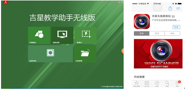 無線展臺,咋聽起來感覺比有線展臺連接要麻煩,但試過之后你會發現也簡單得用一句話就可以解釋清楚:啟動展臺—電腦/手機搜索到吉星WiFi—輸入密碼完成連接-打開無線教學助手軟件—開始使用。實踐也證明超級簡單,在學校的使用,都是讓班長或者值日生先連接好,老師一到教室就可以直接開始用了。
